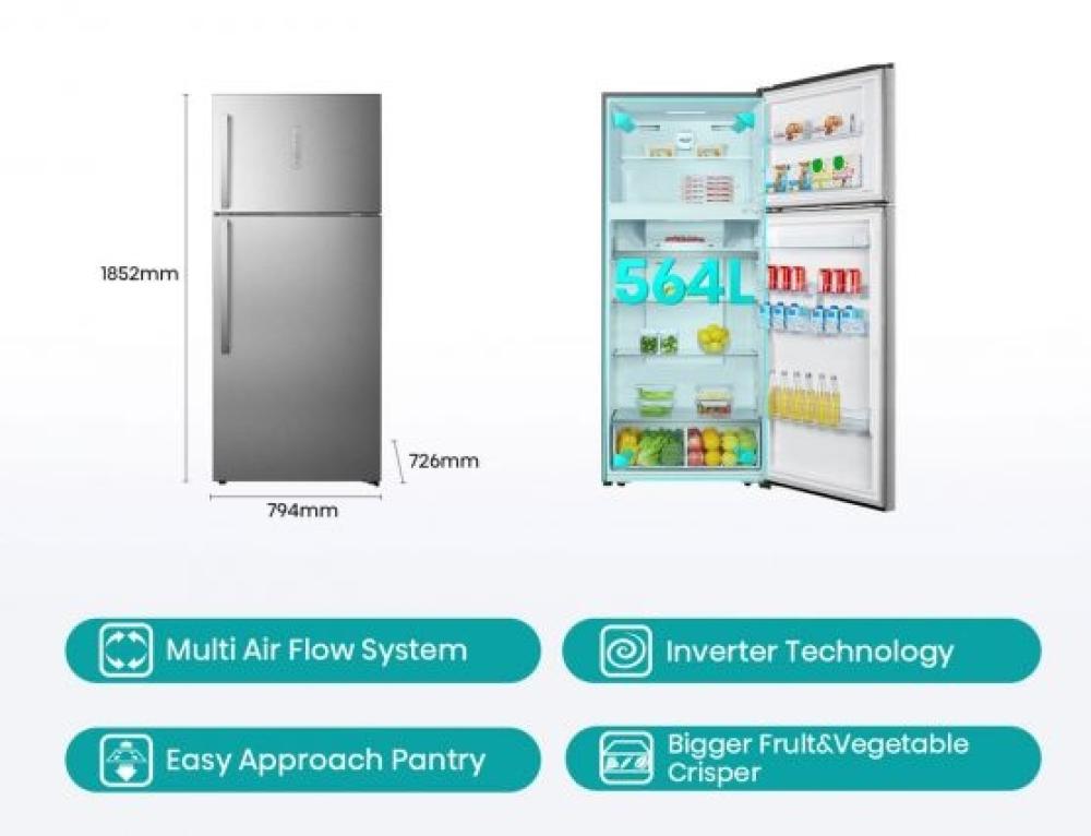 - هايسنس ثلاجة بابين توفر توزيع هواء فعال والأرفف القابلة للتغيير لمزيد من التنظيم.